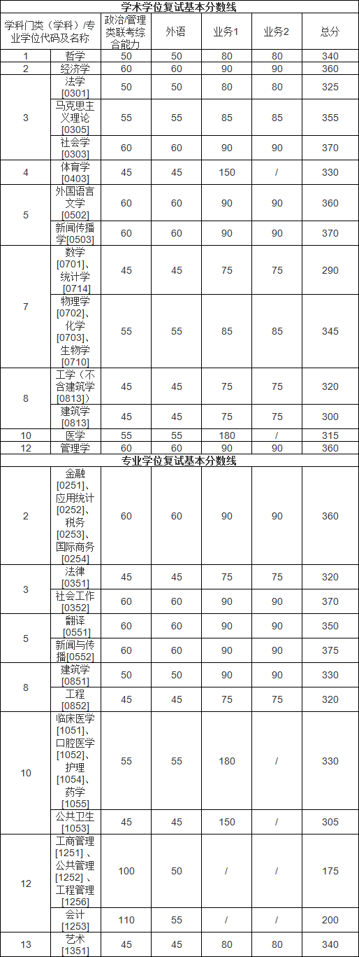 1.復試基本分數(shù)線為相應學科門類(學科)/專業(yè)學位的最低分數(shù)線,單科、總分須同時滿足要求。各招生學院可根據(jù)其招生名額和生源等情況,按一定的差額復試比例上浮復試分數(shù)線并確定復試考生名單。