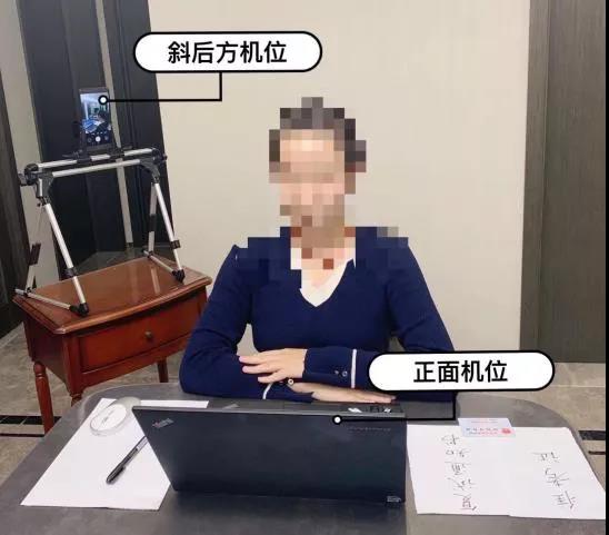 考生要雙機(jī)位模式參加復(fù)試,即需要注冊申請兩個(gè)獨(dú)立賬號同時(shí)進(jìn)入候考室或復(fù)試室,分別登陸兩部帶攝像頭的設(shè)備,手機(jī)或電腦均可。一臺(tái)設(shè)備從正面拍攝,另一臺(tái)設(shè)備從考生側(cè)后方拍攝。考生端兩臺(tái)設(shè)備開啟攝像頭,一臺(tái)設(shè)備將攝像頭對準(zhǔn)考生本人,另一臺(tái)設(shè)備攝像頭從考生后方成45°拍攝(后方拍攝的設(shè)備須靜麥和關(guān)閉音頻,防止回音影響復(fù)試),并保證考生端考試屏幕能清晰地被復(fù)試專家組看到。