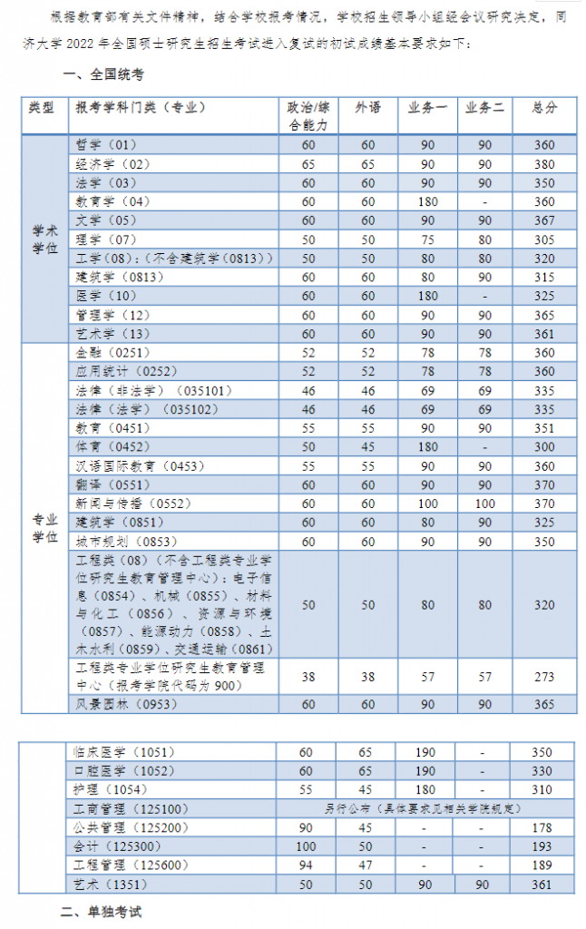 2022年同濟(jì)大學(xué)研究生復(fù)試分?jǐn)?shù)線已公布院校動(dòng)態(tài)