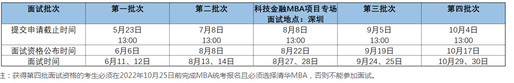 ②填寫和上傳申請(qǐng)材料。網(wǎng)上提交的申請(qǐng)材料包括:申請(qǐng)書、成績單、個(gè)人簡歷、收入證明、單位組織結(jié)構(gòu)圖,推薦信(0-3封)。申請(qǐng)材料的具體內(nèi)容和要求見系統(tǒng)內(nèi)說明??忌峤簧暾?qǐng)材料時(shí)需要選擇申請(qǐng)面試批次,并在所選批次申請(qǐng)材料提交截止日期前提交。其中科技金融MBA項(xiàng)目專場僅面向申請(qǐng)清華科技金融MBA項(xiàng)目的考生,且面試地點(diǎn)在深圳。各批次的申請(qǐng)截止時(shí)間、面試資格公布時(shí)間和面試時(shí)間見下方”面試批次”表。