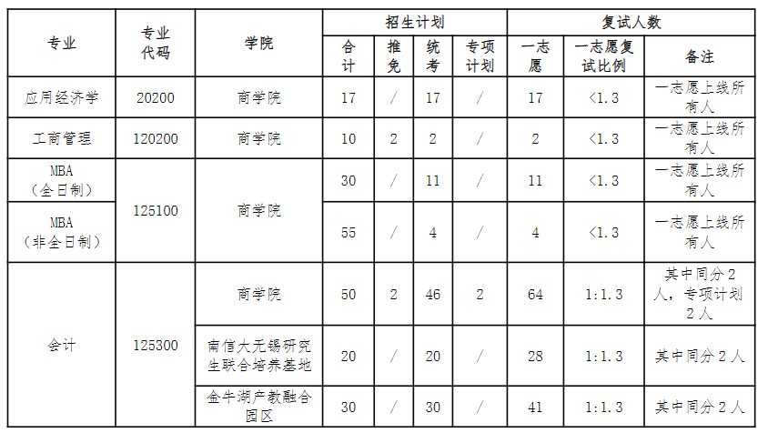 根據(jù)教育部關于研究生錄取工作中要堅持“按需招生、德智體全面衡量、擇優(yōu)錄取、寧缺毋濫”的原則及相關規(guī)定,為保證我院碩士研究生招生工作的順利進行,提高招生工作效率和保證生源質(zhì)量,既維護考生權益,又保證公平、公正、公開,根據(jù)南京信息工程大學2022年招收攻讀碩士學位研究生復試及錄取工作相關文件,結合我院實際情況,經(jīng)我院研究生復試工作領導小組討論,特制定020200應用經(jīng)濟學、120200工商管理、125100工商管理碩士(MBA)、125300會計專碩四個碩士專業(yè)復試及錄取工作細則。一、招生指標、復試比例及復試名單確定根據(jù)研究生院相關文件,實行差額復試,復試名單以研究生院公布的名單為準。各專業(yè)招生計劃及復試名額如下: