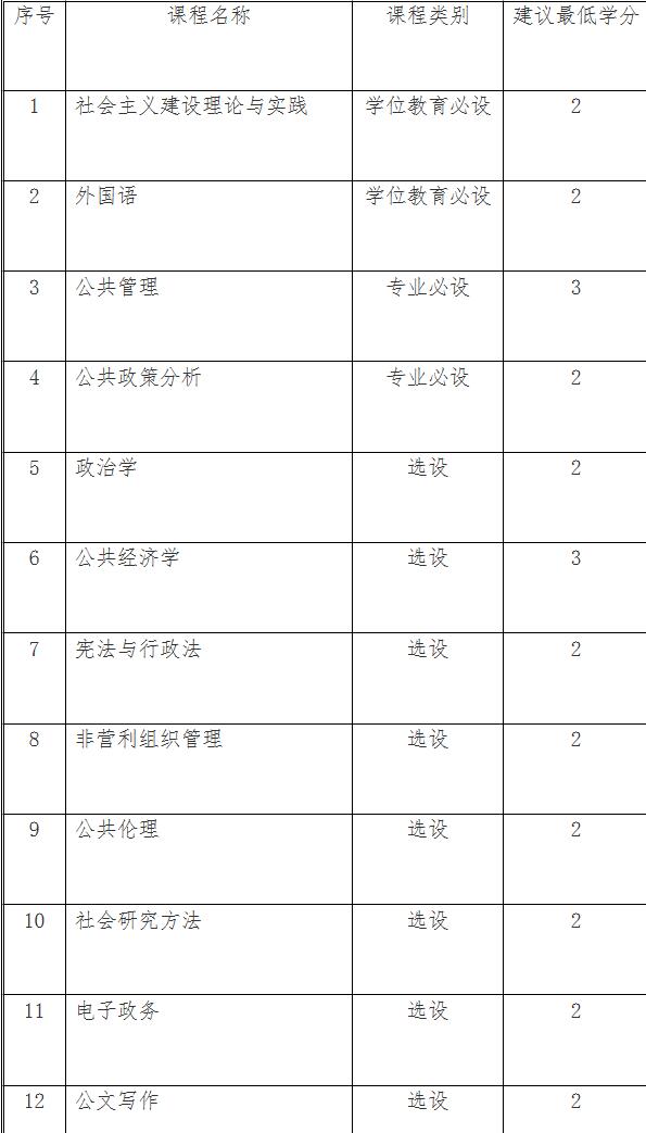 1.核心課是學(xué)生必修課程。“核心課程目錄”共列12門課,其中,“社會(huì)主義建設(shè)理論與實(shí)踐”和“外國語”為學(xué)位教育必設(shè)課程;“公共管理”和“公共政策分析”是本專業(yè)必設(shè)核心課程;其他核心課程,由各培養(yǎng)院校從“核心課程目錄”中選擇開設(shè)。