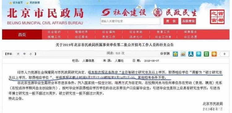 2019年8月份的時(shí)候,北京市民政局官網(wǎng)發(fā)布的一條招考工作人員公告中,事業(yè)單位首次將非全和全日制放在同等地位,兌現(xiàn)了教育部文件中提到的:全日制和非全日制研究生實(shí)行相同的考試招生政策和培養(yǎng)標(biāo)準(zhǔn),其學(xué)歷學(xué)位證書具有同等法律地位和相同效力。