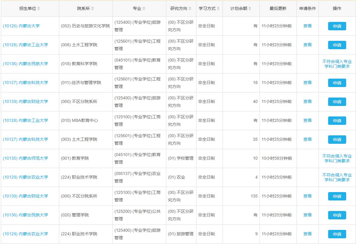 內(nèi)蒙古2022年MBA、MPA、MTA、MEM調(diào)劑匯總